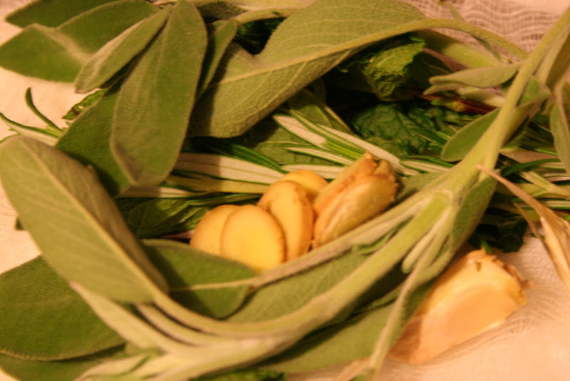 First, you want to assemble your herb bundle. Cut a piece of cheese cloth large enough to wrap around the herbs twice. Lay the sprigs of rosemary, sage leaves and mint leaves on the cheese cloth.