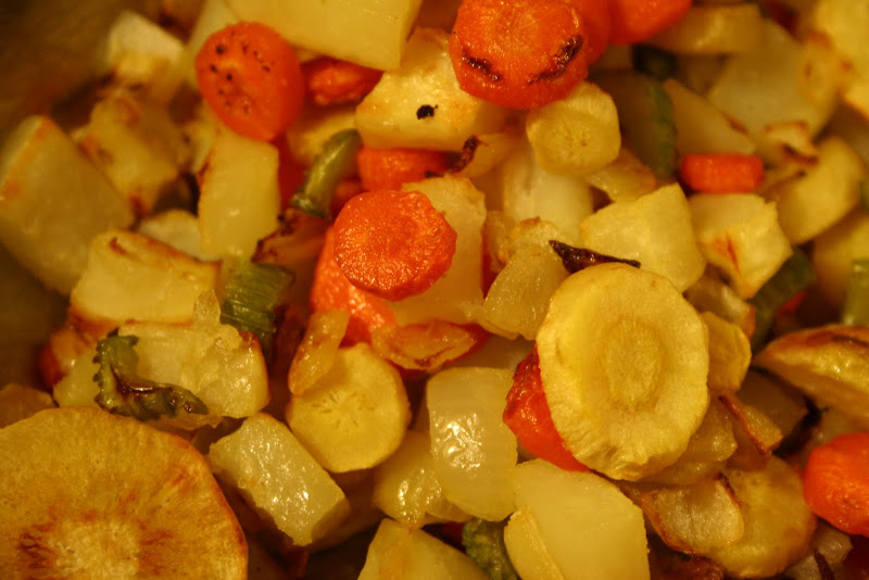 Roast in the oven on 375 for 15-20 minutes or until vegetables are a golden brown and tender. Turn with a spatula about half way through cooking time.