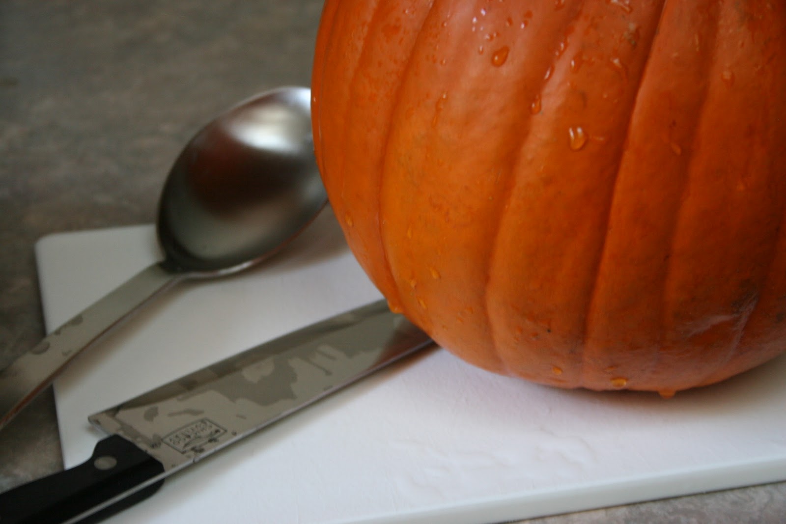 Next you will need to cut the top off of the pumpkin (like when carving it for Halloween) and clean out the seeds.